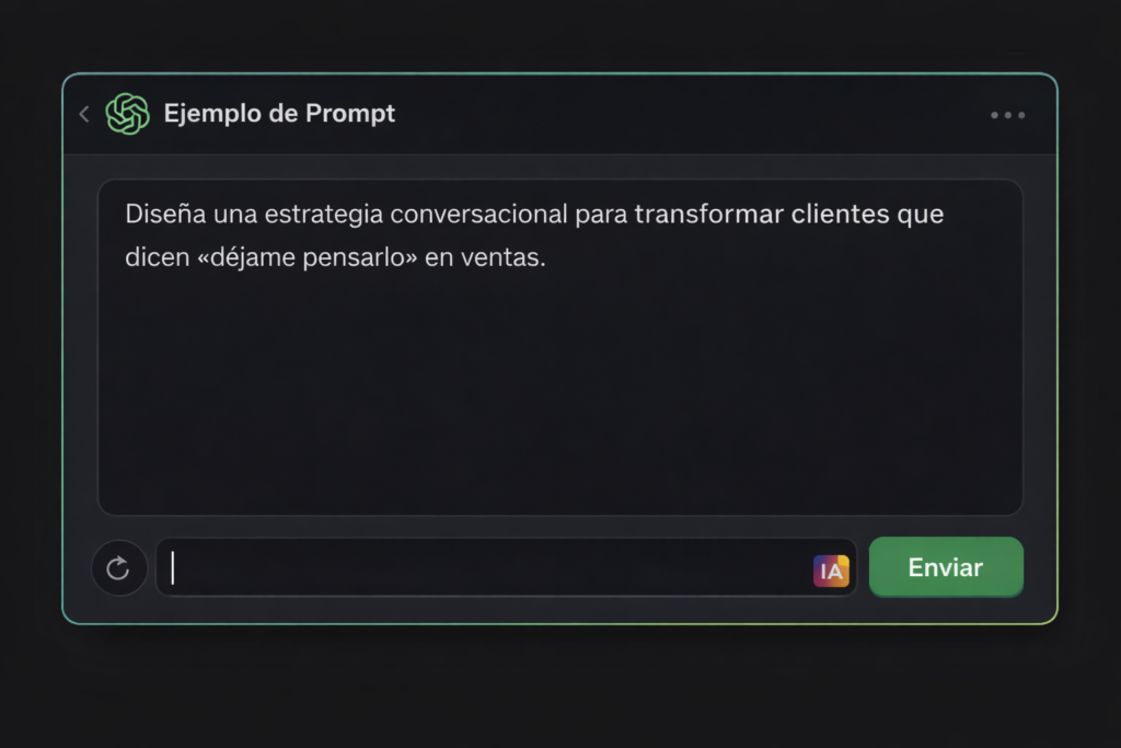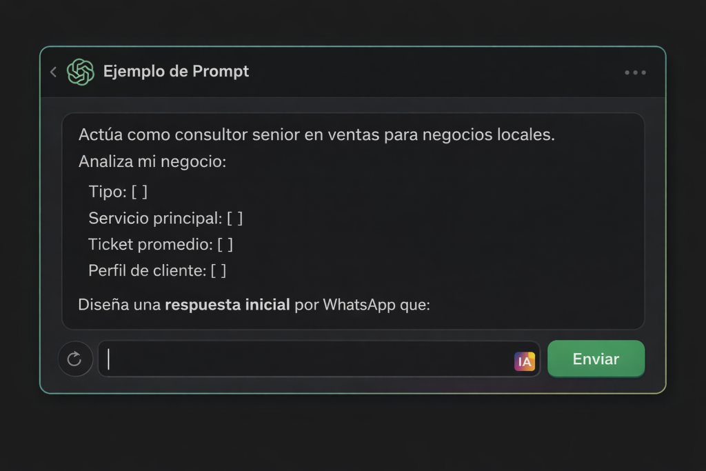 Un prompt es lo que le escribes a ChatGPT para que te diga exactamente qué hacer para vender. Con Vende Local solo copias, pegas y ejecutas. No necesitas experiencia previa.